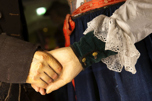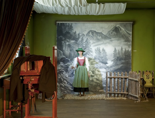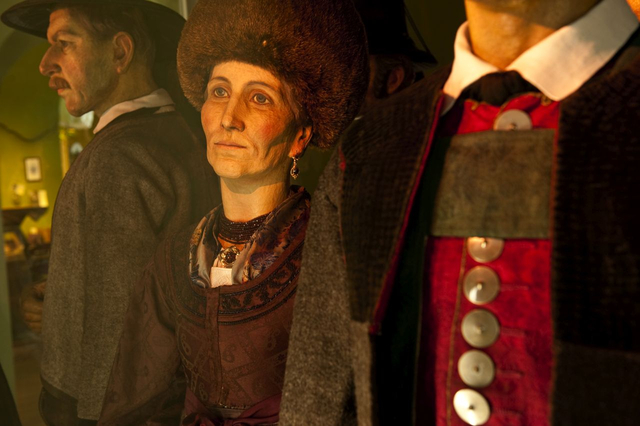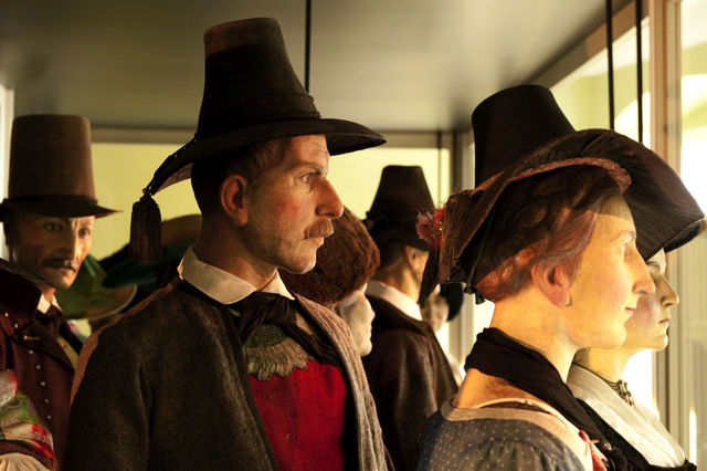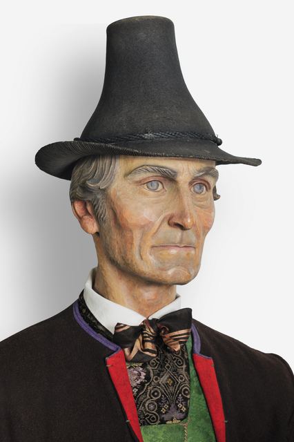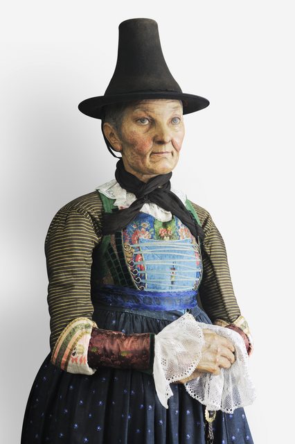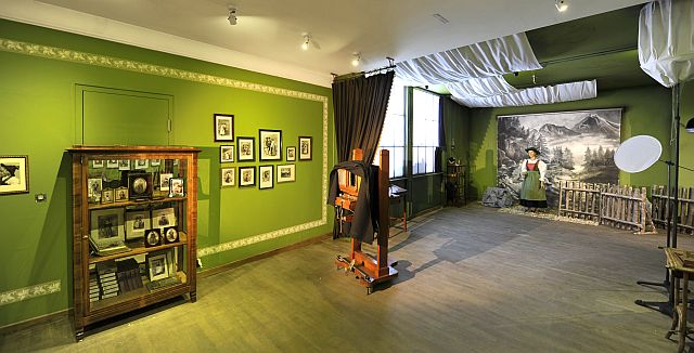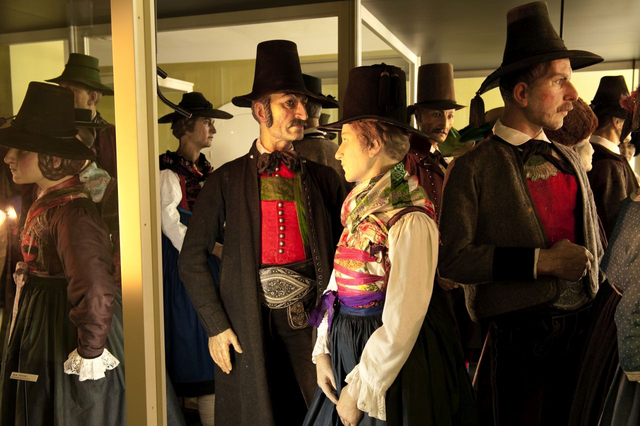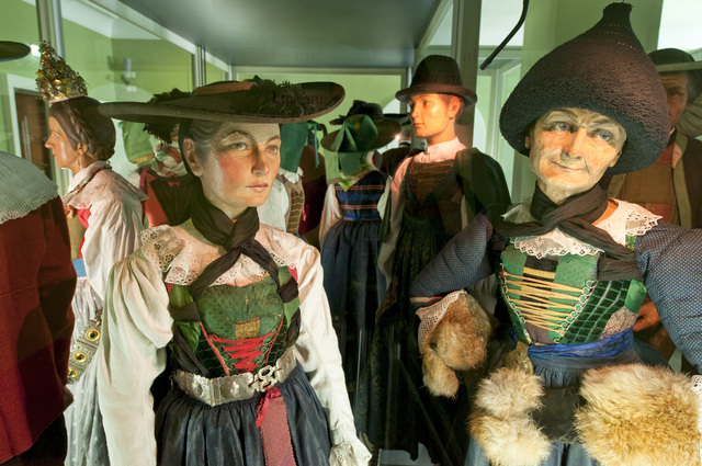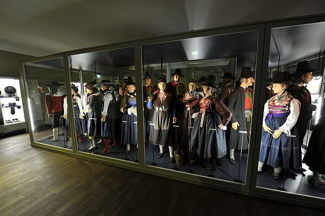 Mit Tracht bezeichnete man über Jahrhunderte hinweg die Bekleidung im Allgemeinen. War zuvor die Zugehörigkeit zu einem Berufs- oder einem sozialen Stand an ihr abzulesen, sollte die Tracht im 19. Jahrhundert insbesondere Regionen voneinander unterscheiden. Im letzten Viertel des 19. Jahrhunderts wurden die farbenfrohen Festtagskleider, wie sie an 48 überlebensgroßen Holzfigurinen zu sehen sind, beim Bildungsbürgertum populär. Die Figurinen schnitzte der Osttiroler Virgil Rainer anlässlich der Eröffnung des Museums 1929 für den sogenannten "Trachtensaal". Das Fotostudio am Eingang des Themenbereiches "Schein und Sein" wurde nach historischen Vorbildern rekonstruiert und bringt den romantischen Blick auf die ländliche Bevölkerung sowie die Idealisierung einer um 1900 bereits abgelegten Kleidung zum Ausdruck.