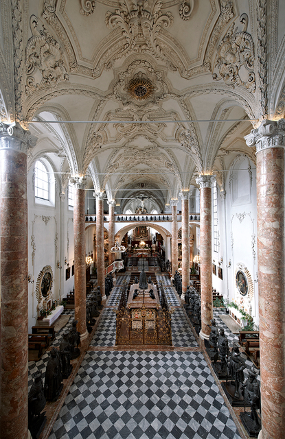 Hauptattraktion sind die 28 überlebensgroßen Bronzestatuen, welche das imposante Hochgrab Kaiser Maximilians I. flankieren. Die "Ahnengalerie" stellt seine Verwandtschaft aus der Habsburgerfamilie, aber auch seine persönlichen Vorbilder wie den sagenhaften König Artus dar. Die Figur des Kaisers kniet betend auf seinem Kenotaph.